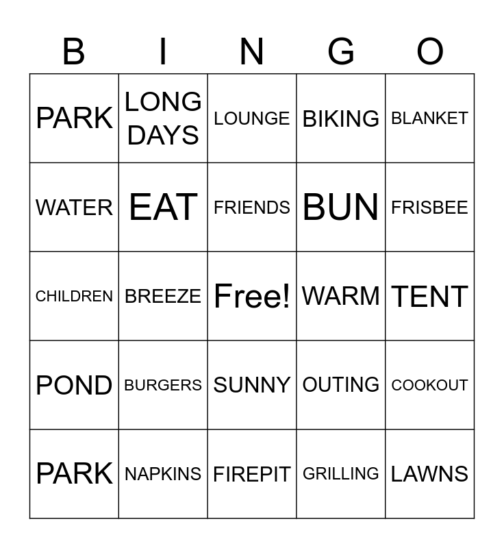 This bingo card has a free space and 24 words: BURGERS, NAPKINS, FRIENDS, PARK, BLANKET, PARK, WATER, LONG DAYS, WARM, SUNNY, BUN, CHILDREN, OUTING, COOKOUT, EAT, GRILLING, TENT, LOUNGE, FRISBEE, BREEZE, LAWNS, POND, BIKING and FIREPIT.
