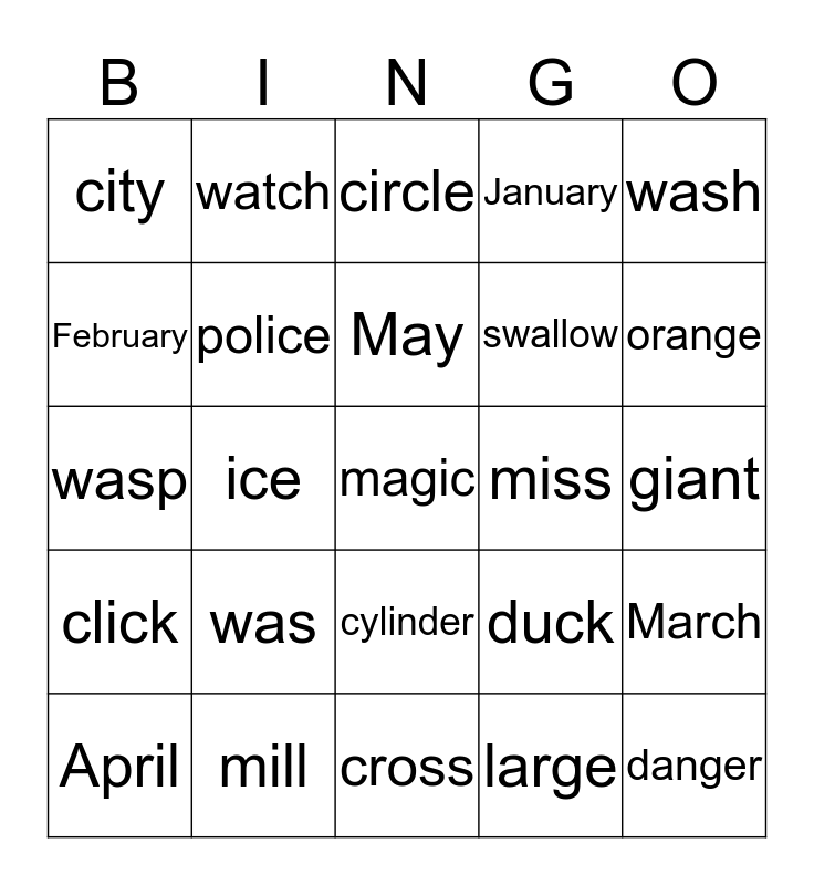 This bingo card has 30 words: mill, tell, ice, dance, city, circle, police, cylinder, miss, cross, giant, magic, large, danger, orange, vegetable, duck, click, was, wash, wasp, swan, watch, swallow, February, January, March, April, May and June.
