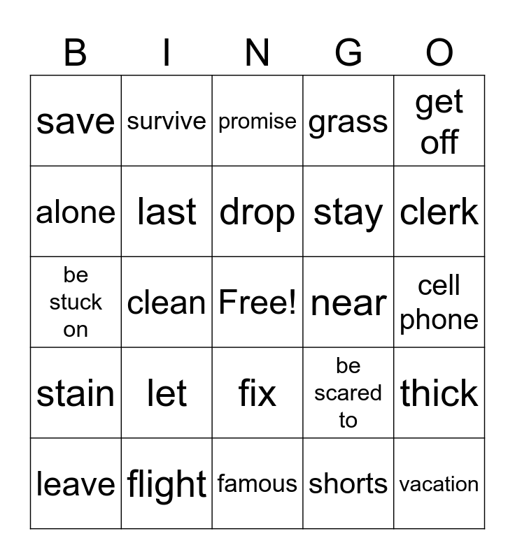 This bingo card has a free space and 29 words: leave, choice, clean, area, save, promise, last, let, near, flight, cell phone, vacation, famous, shorts, clerk, borrow, fix, stain, get off, be stuck on, be scared to, take medicine, stay, alone, grass, survive, thick, drop and squeeze.