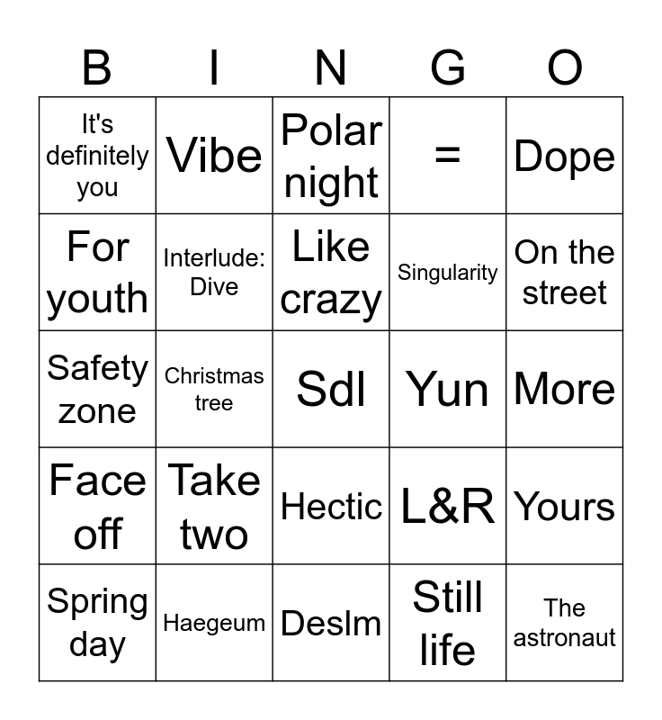 This bingo card has a free space and 24 words: Take two, Haegeum, Like crazy, Spring day, Dope, It's definitely you, For youth, Vibe, Yun, Hectic, Singularity, Safety zone, L&R, Yours, Interlude: Dive, Still life, More, Polar night, On the street, Christmas tree, The astronaut, Face off, = and Deslm.