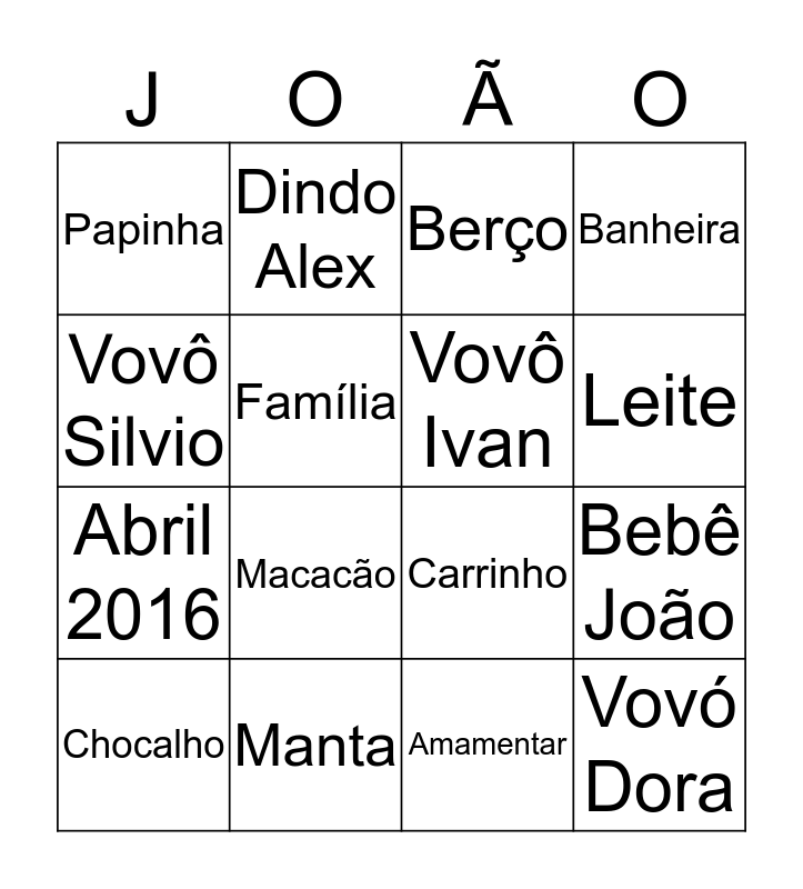 This bingo card has 32 words: Mamãe Nayara, Papai Alan, Bebê João, Vovó Sinara, Vovó Dora, Vovô Ivan, Vovô Silvio, Dinda Tay, Dindo Alex, Tia Milene, Leite, Berço, Fralda, Enxoval, Manta, Brinquedos, Amor, Carrinho, Ultrassom, Gestação, Móbile, Maternidade, Amamentar, Mamadeira, Chocalho, Banheira, Abril 2016, Família, Papinha, Trocador, Body and Macacão.