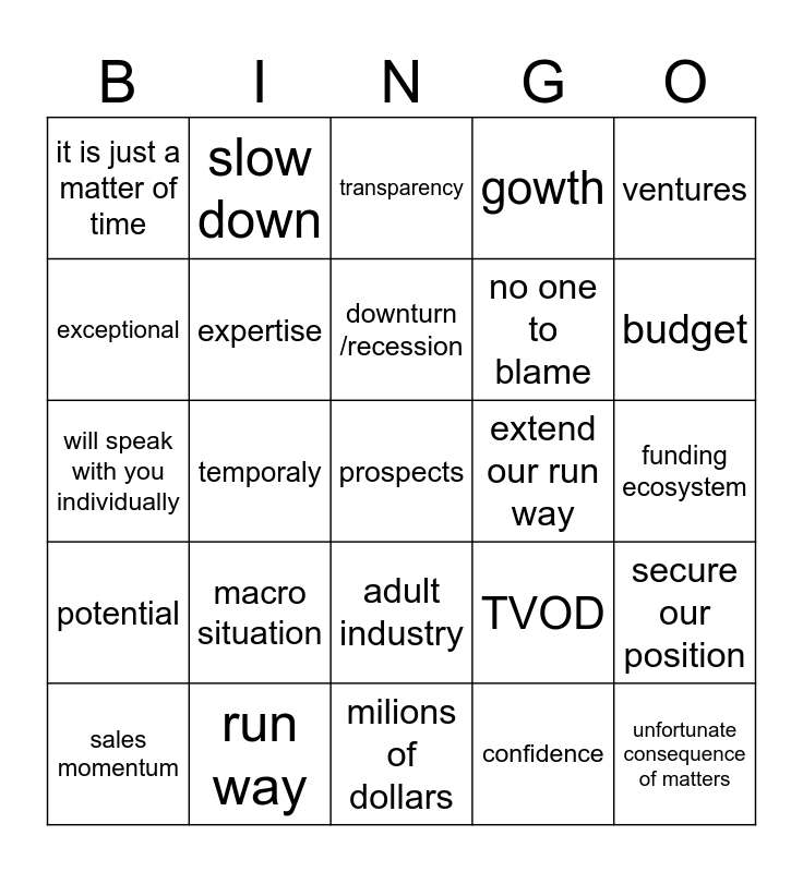 This bingo card has a free space and 24 words: macro situation, run way, downturn /recession, sales momentum, ventures, it is just a matter of time, exceptional, slow down, extend our run way, adult industry, no one to blame, will speak with you individually, TVOD, secure our position, expertise, confidence, funding ecosystem, transparency, budget, temporaly, unfortunate consequence of matters, potential, gowth and milions of dollars.