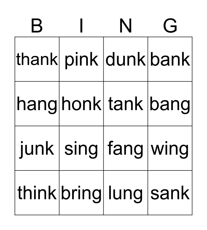 This bingo card has a free space and 15 words: think, sank, dunk, thank, bang, hang, sing, lung, honk, junk, wing, bank, tank, pink and bring.