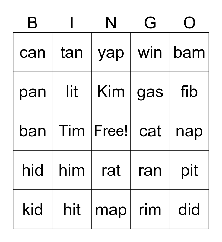 This bingo card has a free space and 24 words: him, hit, Kim, kid, bam, can, pan, tan, cat, rat, gas, ban, ran, pit, lit, rim, nap, yap, fib, Tim, did, hid, win and map.