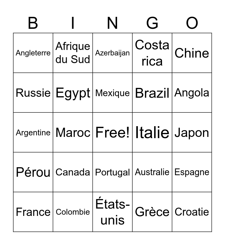 This bingo card has a free space and 25 words: Canada, États-unis, Mexique, France, Chine, Angleterre, Russie, Afrique du Sud, Italie, Portugal, Brazil, Argentine, Australie, Espagne, Egypt, Inde, Japon, Azerbaijan, Angola, Maroc, Croatie, Colombie, Pérou, Costa rica and Grèce.