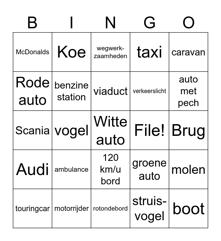 This bingo card has a free space and 29 words: touringcar, bord met P, vogel, kerk, McDonalds, wegwerk- zaamheden, benzine station, ambulance, File!, motorrijder, Brug, boot, rotondebord, struis- vogel, auto met pech, wegenwacht, 120 km/u bord, Audi, caravan, Scania, groene auto, fietser, verkeerslicht, Rode auto, taxi, Koe, molen, viaduct and wegrestaurant.