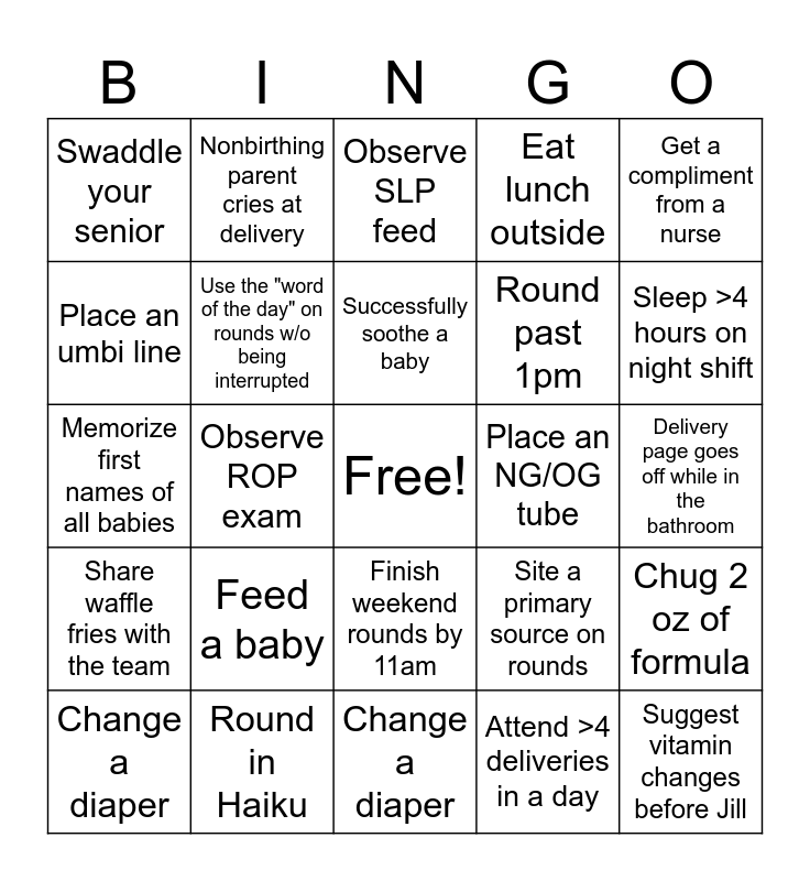 This bingo card has a free space and 24 words: Feed a baby, Round in Haiku, Successfully soothe a baby, Change a diaper, Get a compliment from a nurse, Swaddle your senior, Place an umbi line, Nonbirthing parent cries at delivery, Place an NG/OG tube, Finish weekend rounds by 11am, Round past 1pm, Memorize first names of all babies, Site a primary source on rounds, Chug 2 oz of formula, Use the "word of the day" on rounds w/o being interrupted, Attend >4 deliveries in a day, Delivery page goes off while in the bathroom, Observe SLP feed, Sleep >4 hours on night shift, Observe ROP exam, Suggest vitamin changes before Jill, Share waffle fries with the team, Eat lunch outside and Change a diaper.