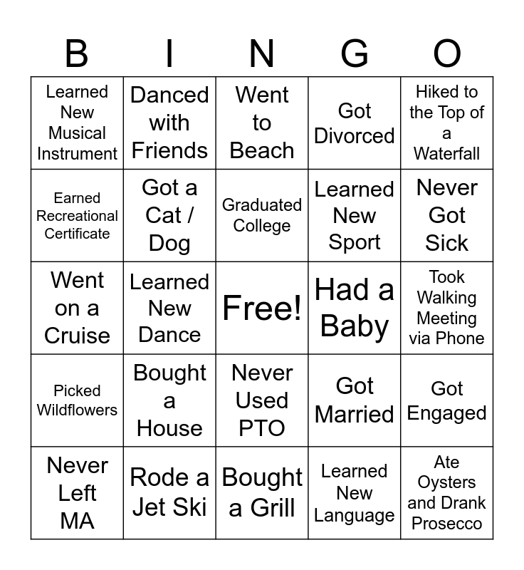 This bingo card has a free space and 49 words: Achieved New Years Resolution, Ate Oysters and Drank Prosecco, Bought a Car, Bought a Grill, Bought a House, Broke Up with Someone, Danced with Friends, Earned Professional Certificate, Earned Recreational Certificate, Fell in Love, Got a Cat / Dog, Got Divorced, Got Engaged, Got Married, Got New Roommate(s), Got Promoted, Graduated College, Had a Baby, Had Surgery, Hiked to the Top of a Waterfall, Learned New Dance, Learned New Language, Learned New Musical Instrument, Learned New Sport, Moved to New Home, Never Got Sick, Never Left MA, Never Rode on MBTA, Never Used PTO, Picked Wildflowers, Planted a Garden, Rescued a Person, Rescued an Animal, Rode a Horse, Rode a Jet Ski, Rode a Snowmobile, Shoveled Snow for a Neighbor, Took a Cooking Class, Took Walking Meeting via Phone, Visited a “Wonder of the World”, Visited Another Country, Volunteered, Watched the Sunrise, Went Camping, Went on a Cruise, Went to Beach, Won More than $100, Wore Underwear during Video Meeting and Worked Remotely (not from home).