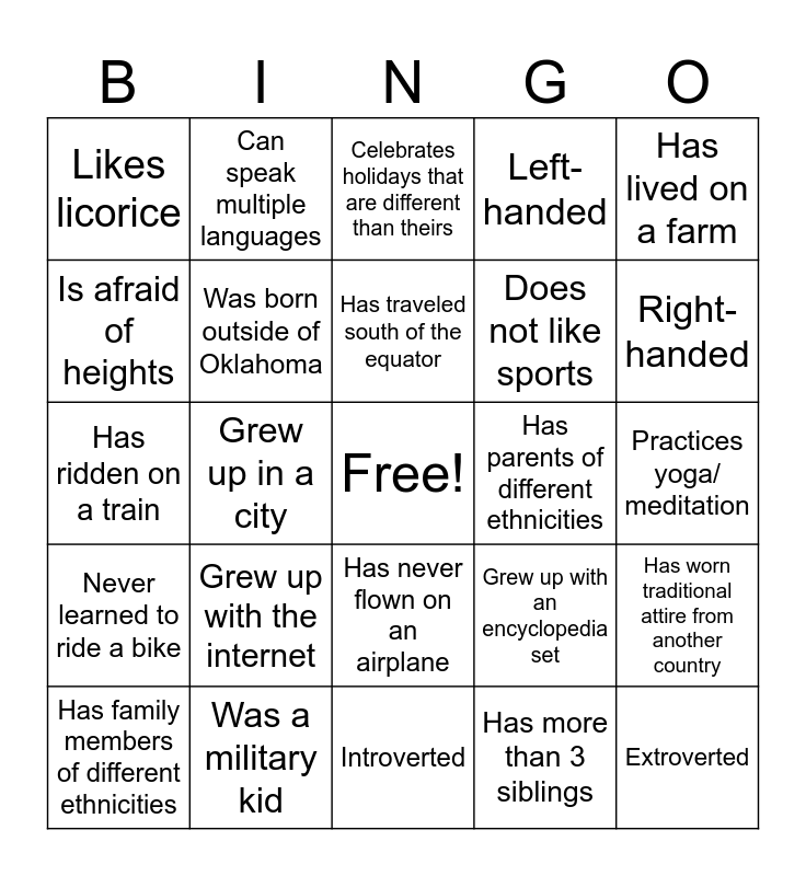 This bingo card has a free space and 24 words: Grew up with the internet, Was a military kid, Has traveled south of the equator, Has family members of different ethnicities, Has lived on a farm, Likes licorice, Is afraid of heights, Can speak multiple languages, Has parents of different ethnicities, Has never flown on an airplane, Does not like sports, Has ridden on a train, Grew up with an encyclopedia set, Has worn traditional attire from another country, Was born outside of Oklahoma, Has more than 3 siblings, Practices yoga/ meditation, Celebrates holidays that are different than theirs, Right-handed, Grew up in a city, Extroverted, Never learned to ride a bike, Left-handed and Introverted.