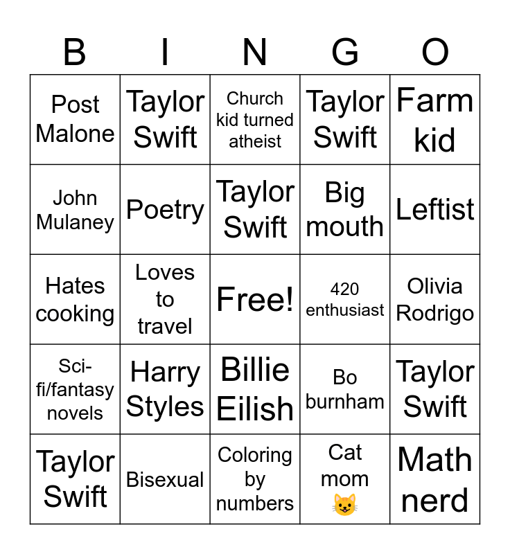 This bingo card has a free space and 29 words: Taylor Swift, Indian food, Loves to travel, Vinyl collector, Post Malone, Church kid turned atheist, Poetry, Harry Styles, 420 enthusiast, Bisexual, Olivia Rodrigo, Math nerd, Coloring by numbers, Cat mom 😺, Leftist, Avatar last air bender/ legend of Korra, Billie Eilish, Sci-fi/fantasy novels, Farm kid, Hates cooking, Bo burnham, Rubik’s cubes, Big mouth, John Mulaney, Taylor Swift, Taylor Swift, Taylor Swift, Taylor Swift and Taylor Swift.