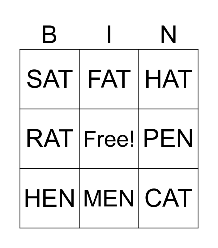 This bingo card has a free space and 8 words: RAT, FAT, PEN, HEN, HAT, SAT, MEN and CAT.