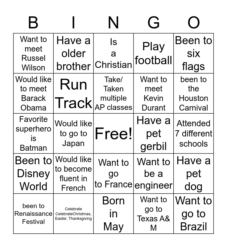 This bingo card has a free space and 24 words: Would like to become fluent in French, Celebrate CelebrateChristmas, Easter, Thanksgiving, Take/ Taken multiple AP classes, been to Renaissance Festival, Been to six flags, Want to meet Russel Wilson, Would like to meet Barack Obama, Have a older brother, Have a pet gerbil, Want to go to France, Want to meet Kevin Durant, Favorite superhero is Batman, Want to be a engineer, Have a pet dog, Run Track, Want to go to Texas A& M, Attended 7 different schools, Is a Christian, been to the Houston Carnival, Would like to go to Japan, Want to go to Brazil, Been to Disney World, Play football and Born in May.