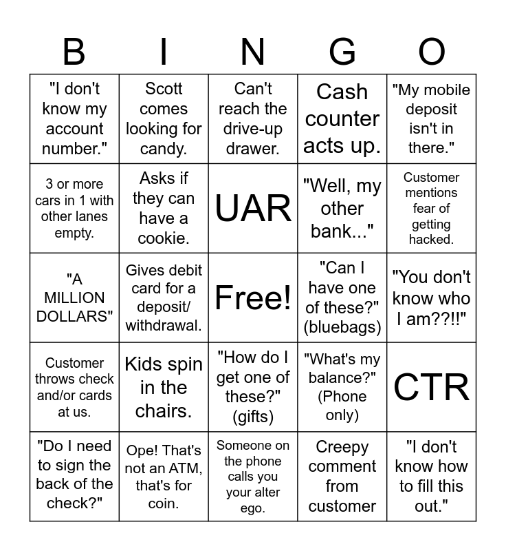This bingo card has a free space and 29 words: "Do I need to sign the back of the check?", "They said I could do it last time", Gives debit card for a deposit/ withdrawal., Coin machine acts up., "I don't know my account number.", Can't reach the drive-up drawer., Asks if they can have a cookie., Kids spin in the chairs., "Can I have one of these?" (bluebags), Ope! That's not an ATM, that's for coin., "You don't know who I am??!!", "I don't know how to fill this out.", Someone on the phone calls you your alter ego., Creepy comment from customer, Customer mentions fear of getting hacked., "WHERE IS THE TABLE", "How do I get one of these?" (gifts), Customer throws check and/or cards at us., "My mobile deposit isn't in there.", "A MILLION DOLLARS", "What's my balance?" (Phone only), "Where's your bathroom?", "Well, my other bank...", 3 or more cars in 1 with other lanes empty., Cash counter acts up., Scott comes looking for candy., CTR, UAR and Dispute.