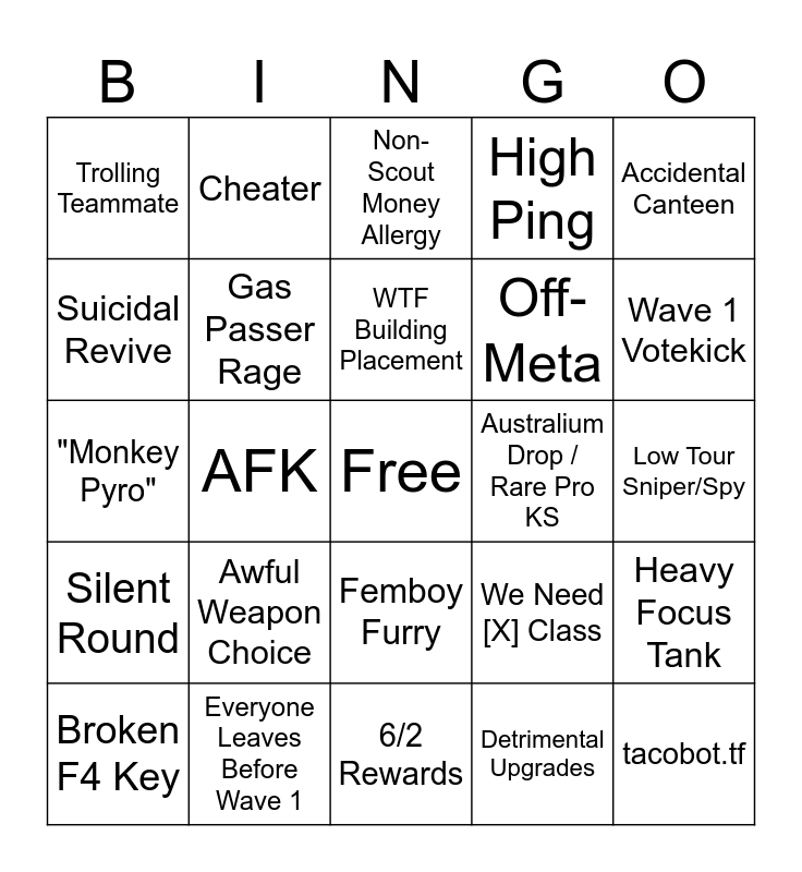 This bingo card has a free space and 34 words: Uber Med Pop, Detrimental Upgrades, Taunt Party, Sentry Buster 2+ Kill, Silent Round, Gas Passer Rage, Accidental Canteen, Broken F4 Key, Cheater, High Tour Low Tour Conflict, WTF Building Placement, Non-Scout Money Allergy, Utter Confusion, Racist/ Homophobic, Australium Drop / Rare Pro KS, Wave 1 Votekick, Everyone Leaves Before Wave 1, "Monkey Pyro", Awful Weapon Choice, We Need [X] Class, Femboy Furry, Kick Scout Lost Credits, Trolling Teammate, Low Tour Sniper/Spy, 6/2 Rewards, tacobot.tf, High Ping, Shooting Sentry Busters, Off-Meta, Suicidal Revive, High Tour Harry [500+ Tours], AFK, Heavy Focus Tank and Back Capped.