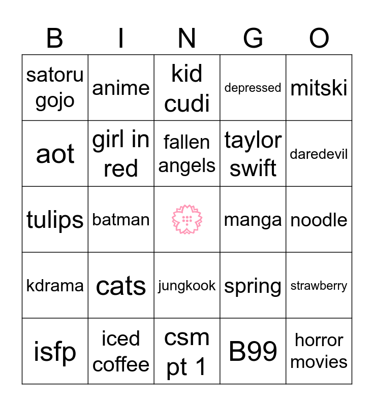 This bingo card has a free space and 24 words: cats, iced coffee, fallen angels, isfp, mitski, satoru gojo, aot, anime, manga, jungkook, taylor swift, tulips, spring, strawberry, girl in red, B99, noodle, kid cudi, daredevil, batman, horror movies, kdrama, depressed and csm pt 1.