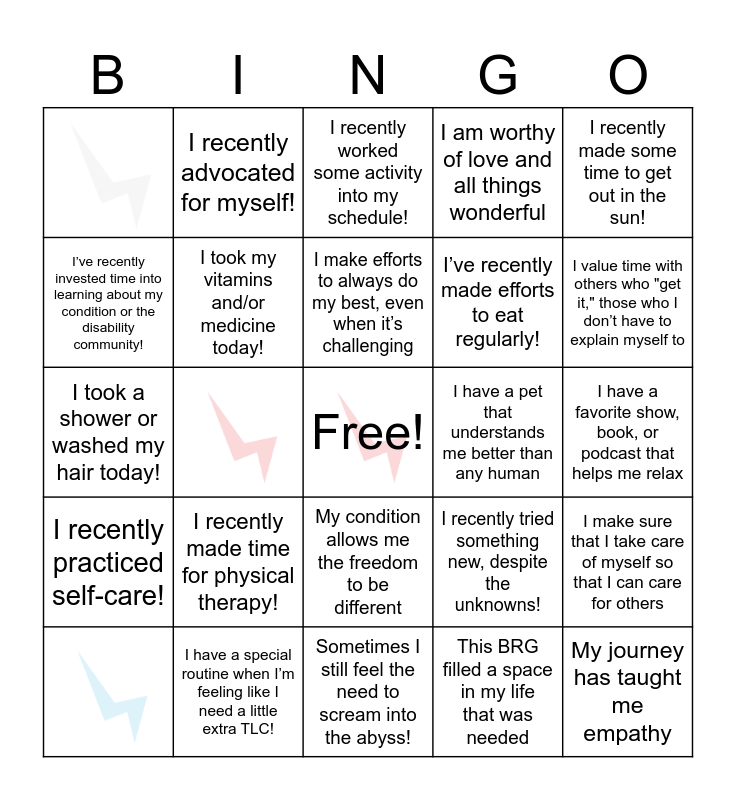 This bingo card has 5 images, a free space and 24 words: I recently worked some activity into my schedule!, I took my vitamins and/or medicine today!, I recently made time for physical therapy!, I have a pet that understands me better than any human, I have a special routine when I’m feeling like I need a little extra TLC!, I have a favorite show, book, or podcast that helps me relax, My journey has taught me empathy, Sometimes I still feel the need to scream into the abyss!, This BRG filled a space in my life that was needed, I value time with others who "get it," those who I don’t have to explain myself to, I have found new hobbies or passions as part of my journey or life adjustment, My condition allows me the freedom to be different, I recently practiced self-care!, I recently made some time to get out in the sun!, I took a shower or washed my hair today!, I recently tried something new, despite the unknowns!, I recently connected with a friend, family member, or coworker!, I’ve recently made efforts to eat regularly!, I’ve recently invested time into learning about my condition or the disability community!, I am worthy of love and all things wonderful, I recently advocated for myself!, I make sure that I take care of myself so that I can care for others, I make efforts to always do my best, even when it’s challenging and I am proud to be an ally!.
