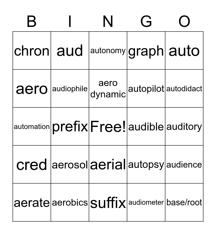 This bingo card has a free space and 24 words: aerosol, aerobics, aero dynamic, aerate, auto, chron, aero, aud, audible, aerial, autopilot, automation, autopsy, audience, audiophile, audiometer, auditory, autonomy, autodidact, prefix, base/root, cred, graph and suffix.