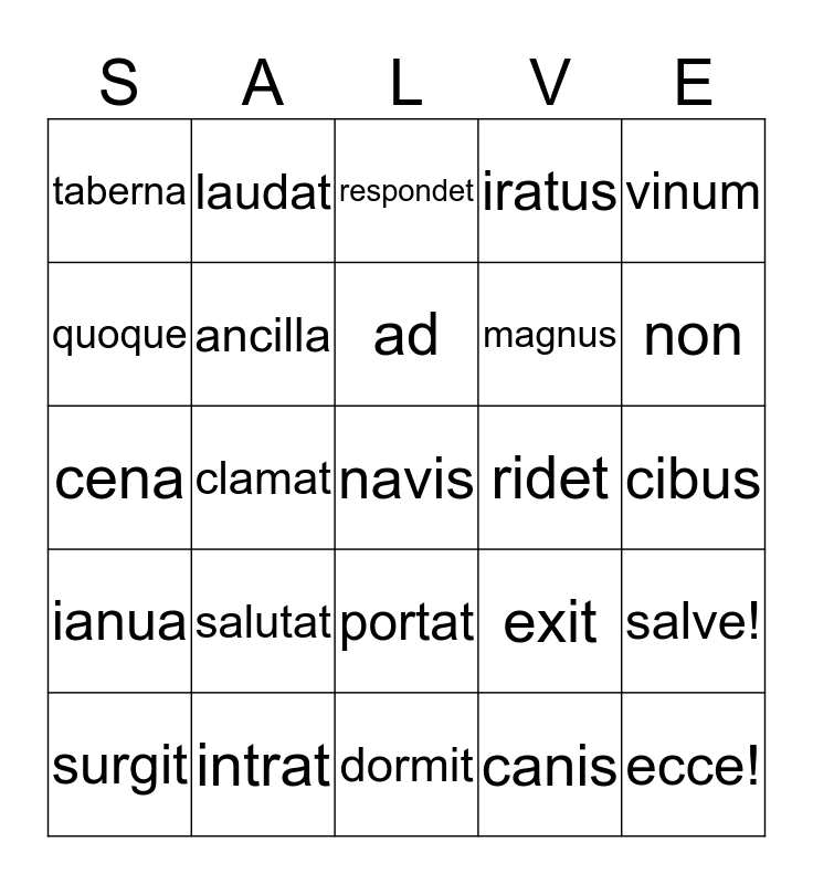 This bingo card has a free space and 24 words: salutat, intrat, ad, surgit, vinum, taberna, quoque, laudat, ridet, portat, magnus, cena, exit, salve!, ancilla, canis, cibus, respondet, non, clamat, ecce!, ianua, iratus and dormit.