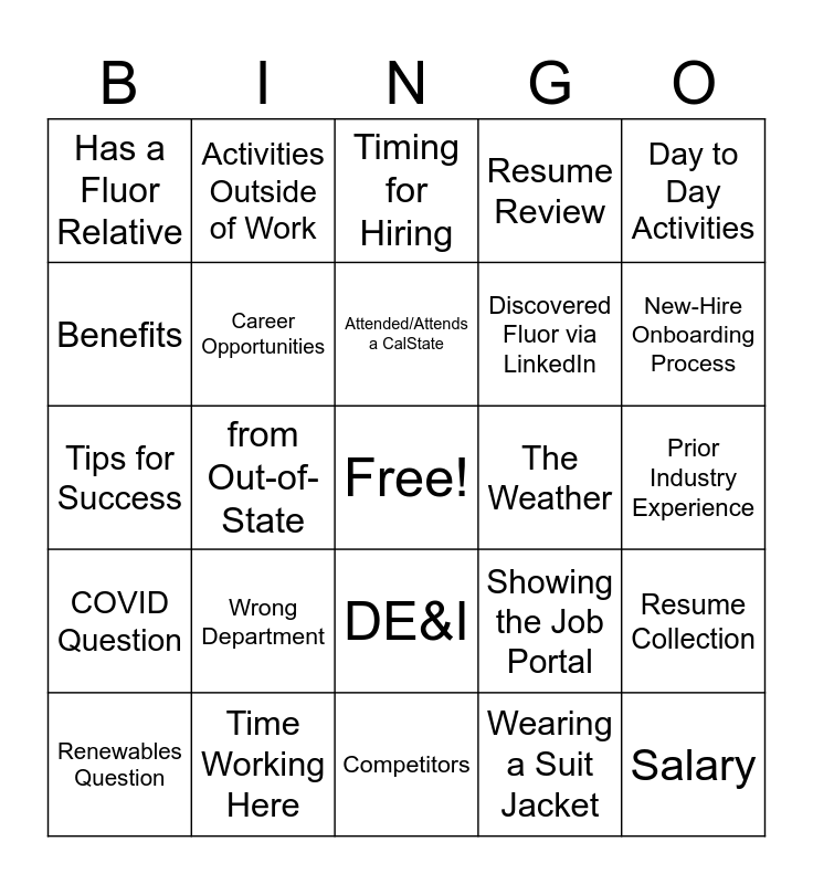 This bingo card has a free space and 50 words: Hybrid Work Schedule, Salary, Offices, Competitors, Wrong Department, Office/Company Culture, Activities Outside of Work, Internships, Benefits, Work hours, Career Opportunities, Resume Review, Resume Collection, Showing the Job Portal, Diversity Question, Job Qualifications, Attended/Attends a CalState, The Weather, Types of Industries, Day to Day Activities, from Out-of-State, Wearing a Suit Jacket, Has a Fluor Relative, Discovered Fluor via LinkedIn, Hiring Process, Fluor’s Vision / Goal, New-Hire Onboarding Process, Training, Timing for Hiring, DE&I, Dress code, Most Challenging Aspect, professional development (certs), Contact Information, Time Working Here, Skills/Experience Needed, Relocation, GAP/Entry Level New-Hire Potential, Senior Level New-Hire Potential, Prior Industry Experience, Industry Trends, Types of Projects, ATLS Question, Oil & Gas Question, Renewables Question, Tips for Success, Has Business Cards, Company Values, COVID Question and Where’s The Bathroom.