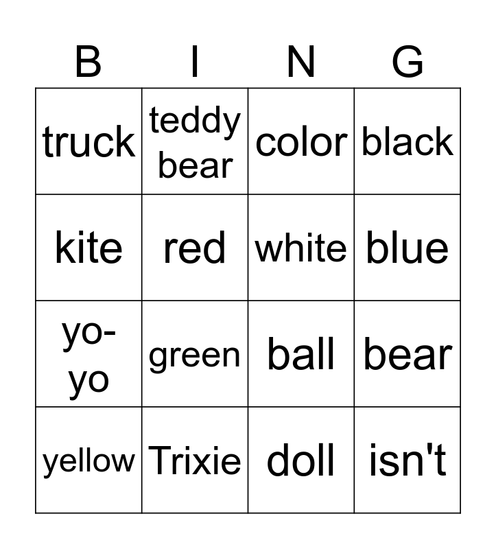 This bingo card has 16 words: Trixie, bear, color, truck, yo-yo, teddy bear, ball, doll, kite, red, yellow, black, green, blue, white and isn't.