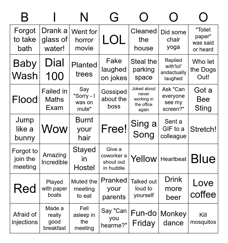 This bingo card has a free space and 48 words: Talked out loud to yourself, Replied with'lol' andactually laughed, Say "Can you hearme?", Wow, Say "Sorry - I was on mute", Stretch!, Drank a glass of water!, Made a really good breakfast, Did some chair yoga, Give a coworker a shout out in huddle, "Toilet paper" was said or heard, LOL, Ask "Can everyone see my screen?", Joked about never working in the office again, Red, Sent a GIF to a colleague, Baby Wash, Who let the Dogs Out!, Drink more beer, Cleaned the house, Steal the parking space, Burnt your hair, Forgot to take bath, Dial 100, Love coffee, Planted trees, Got a Bee Sting, Afraid of injections, Gossiped about the boss, Failed in Maths Exam, Monkey dance, Sing a Song, Blue, Played with paper boats, Jump like a bunny, Yellow, Heartbeat, Flood, Stayed in Hostel, Muted the meeting to eat, Forgot to join the meeting, Kill mosquitos, Went for horror movie, Fell asleep in the meeting, Fake laughed on jokes, Pranked your parents, Amazing Incredible and Fun-do Friday.