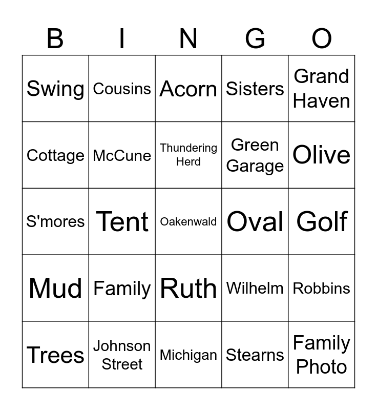 This bingo card has a free space and 75 words: Turtle, Bayou, Acorn, Oak Tree, Gleave, Crane, Clark, Weber, Screen Porch, Fireworks, Bluff, Sand Pile, Thundering Herd, Cottage, Keep up the Good Wok, Tent, White Gate, Family Photo, Softball, Grand Haven, Work Project, S'mores, McCune, Cousins, Sisters, Card Games, Canoe, Row Boat, Swimming, Dock, Beach, 100 Years, 1919, Wilhelm, Olive, Green Garage, Reunion, 4th of July, Golf, Stearns, Pool Noodle, Pier, Family Dinner, Mosquito, Musical Fountain, Generations, Trees, Swing, Jeanne, Mary, Hortie, Ruth, Studio, Duncan, Bob, Fred, Winston, Bridge Swim, Kayak, Duckweed, Family, Pump, Camp Fire, Deck, Out House, Oval, Green House, Felix's, Creek, Robbins, Mud, Johnson Street, Poison Ivy, Michigan and Henry.