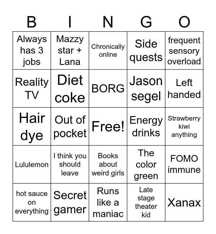This bingo card has a free space and 24 words: I think you should leave, Secret gamer, BORG, hot sauce on everything, frequent sensory overload, Always has 3 jobs, Reality TV, Mazzy star + Lana, Energy drinks, Books about weird girls, Jason segel, Hair dye, The color green, FOMO immune, Diet coke, Late stage theater kid, Strawberry kiwi anything, Chronically online, Left handed, Out of pocket, Xanax, Lululemon, Side quests and Runs like a maniac.