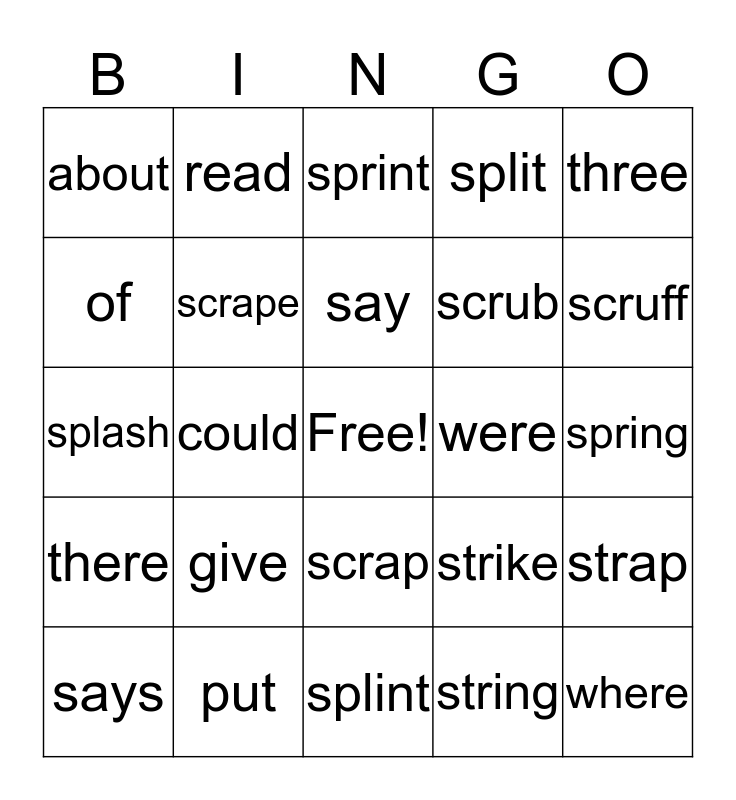 This bingo card has a free space and 24 words: give, put, say, says, three, about, of, read, were, scrap, scrub, splash, strike, strap, scrape, string, spring, sprint, scruff, could, where, there, split and splint.