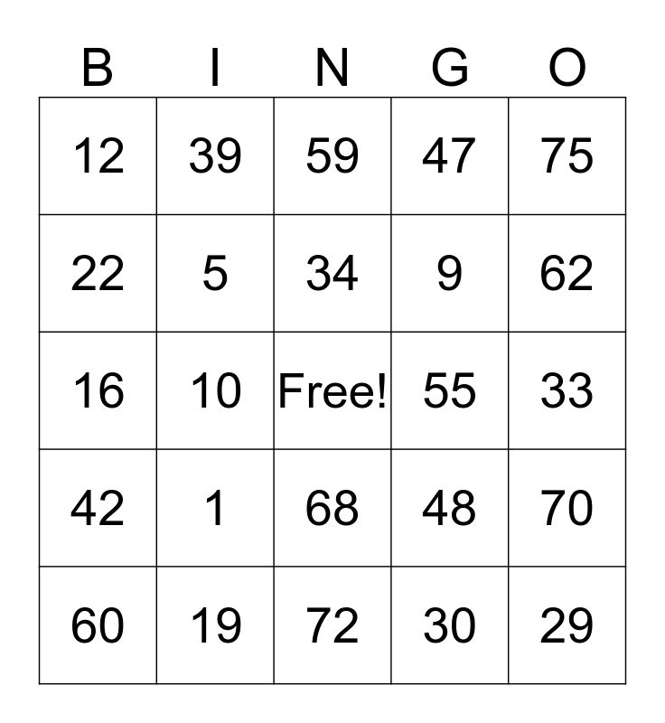 This bingo card has a free space and 24 words: 1, 19, 34, 60, 75, 12, 22, 39, 55, 68, 9, 16, 48, 70, 5, 30, 33, 59, 62, 10, 29, 42, 47 and 72.