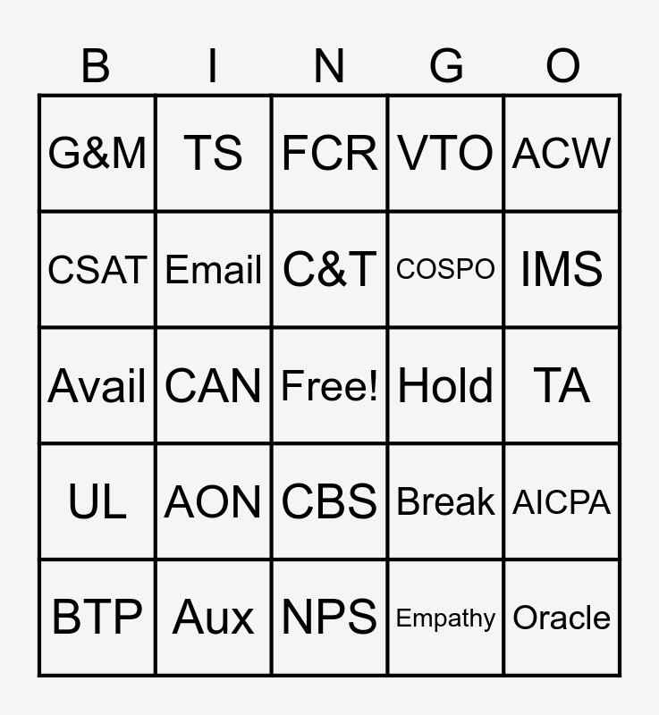 This bingo card has a free space and 24 words: AON, Aux, C&T, BTP, ACW, G&M, CSAT, TS, Hold, CBS, COSPO, Avail, Break, AICPA, Email, Empathy, TA, FCR, IMS, CAN, Oracle, UL, VTO and NPS.