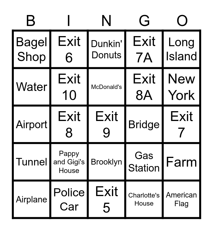 This bingo card has 25 words: Pappy and Gigi's House, Exit 5, McDonald's, Airplane, Long Island, Bagel Shop, Water, Exit 6, Bridge, Brooklyn, Exit 8A, Airport, Gas Station, Farm, Exit 10, American Flag, Exit 7, Dunkin' Donuts, New York, Exit 8, Exit 9, Police Car, Tunnel, Exit 7A and Charlotte's House.