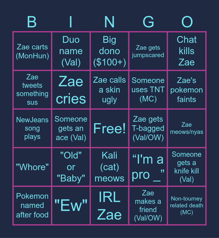 This bingo card has a free space and 26 words: "Whore", "Ew", Zae calls a skin ugly, Zae makes a friend (Val/OW), Chat kills Zae, Zae carts (MonHun), Zae cries, Big dono ($100+), Someone uses TNT (MC), Non-tourney related death (MC), Zae tweets something sus, Someone gets an ace (Val), Team Kill (OW), “I'm a pro _”, Zae meows/nyas, Stream scuff/lag, Duo name (Val), Kali (cat) meows, Zae gets jumpscared, Someone gets a knife kill (Val), NewJeans song plays, "Old" or "Baby", IRL Zae, Zae gets T-bagged (Val/OW), Zae's pokemon faints and Pokemon named after food.