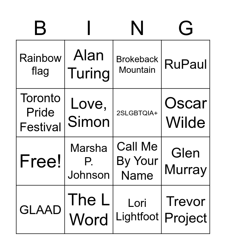 This bingo card has 20 words: Glen Murray, Stonewall Riots, Brokeback Mountain, Coming out, GLAAD, Toronto Pride Festival, The L Word, Rainbow flag, Free!, Alan Turing, Marsha P. Johnson, Call Me By Your Name, Love, Simon, Trevor Project, 2SLGBTQIA+, Umbrella Terms, Oscar Wilde, RuPaul, Lori Lightfoot and Alok Vaid-Menon.