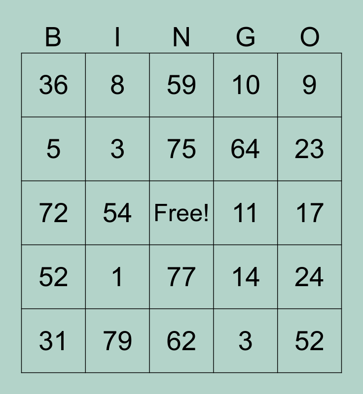 This bingo card has a free space and 25 words: 1, 62, 75, 31, 9, 36, 5, 8, 11, 77, 64, 72, 14, 24, 3, 16, 17, 59, 23, 54, 52, 79, 52, 10 and 3.