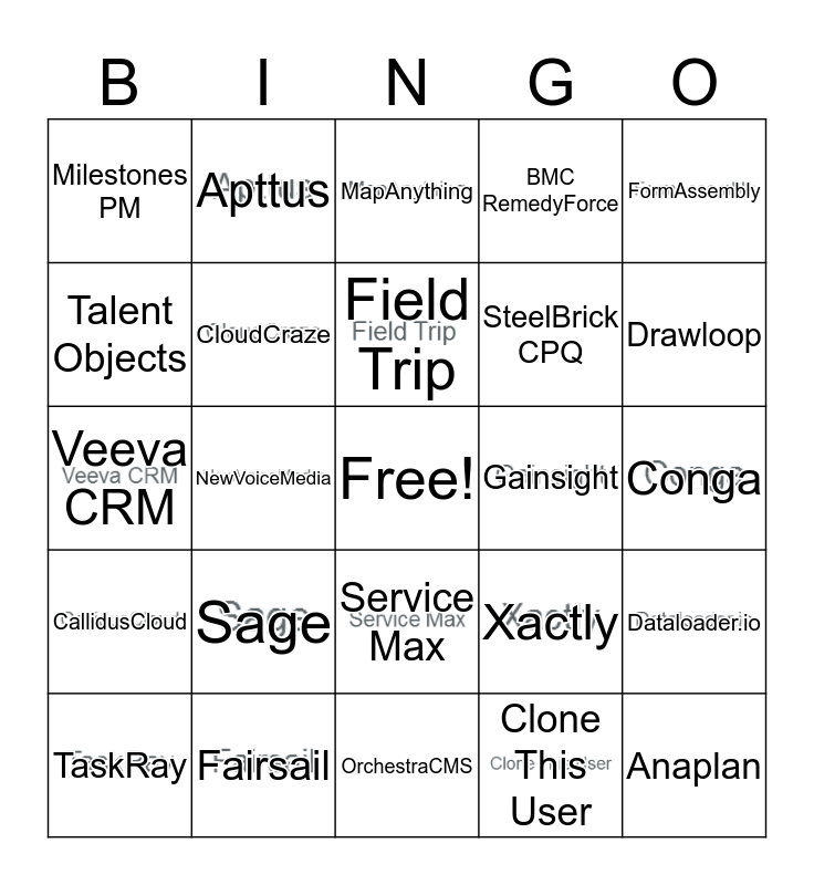 This bingo card has 24 images, a free space and 32 words: Clone This User, Click Software, NewVoiceMedia, Power Dialer, CallidusCloud, CloudCraze, FormAssembly, Dataloader.io, Apttus, CloudSense, Field Trip, MapAnything, DocuSign, GreatVines, Gainsight, Vlocity, TaskRay, Veeva CRM, Service Max, Sage, Xactly, nCino, Conga, Fairsail, Anaplan, BMC RemedyForce, SteelBrick CPQ, Talent Objects, Milestones PM, OrchestraCMS, FinancialForce and Drawloop.