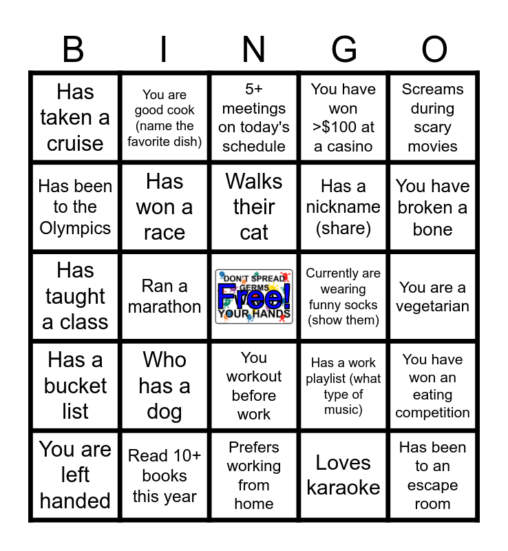 This bingo card has a free space and 24 words: Who has a dog, Read 10+ books this year, Walks their cat, You are left handed, Screams during scary movies, Has taken a cruise, Has been to the Olympics, You are good cook (name the favorite dish), Currently are wearing funny socks (show them), You workout before work, Has a nickname (share), Has taught a class, Has a work playlist (what type of music), You have won an eating competition, Has won a race, Loves karaoke, You are a vegetarian, 5+ meetings on today's schedule, You have broken a bone, Ran a marathon, Has been to an escape room, Has a bucket list, You have won >$100 at a casino and Prefers working from home.