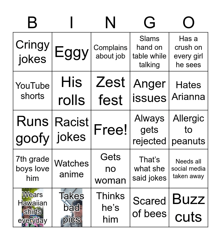This bingo card has 2 images, a free space and 24 words: Watches anime, Takes bad pics, Zest fest, Wears Hawaiian shirts everyday, Has a crush on every girl he sees, Cringy jokes, YouTube shorts, Eggy, Always gets rejected, Gets no woman, Anger issues, Runs goofy, That’s what she said jokes, Needs all social media taken away, His rolls, Scared of bees, Allergic to peanuts, Complains about job, Hates Arianna, Racist jokes, Buzz cuts, 7th grade boys love him, Slams hand on table while talking and Thinks he’s him.