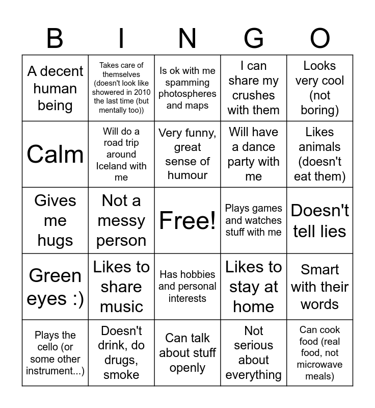 This bingo card has a free space and 24 words: Plays the cello (or some other instrument...), Likes to share music, Very funny, great sense of humour, Not serious about everything, Looks very cool (not boring), A decent human being, Takes care of themselves (doesn't look like showered in 2010 the last time (but mentally too)), Is ok with me spamming photospheres and maps, Plays games and watches stuff with me, Doesn't tell lies, Gives me hugs, Will do a road trip around Iceland with me, Likes to stay at home, Smart with their words, Calm, Doesn't drink, do drugs, smoke, Can talk about stuff openly, I can share my crushes with them, Likes animals (doesn't eat them), Green eyes :), Not a messy person, Has hobbies and personal interests, Will have a dance party with me and Can cook food (real food, not microwave meals).