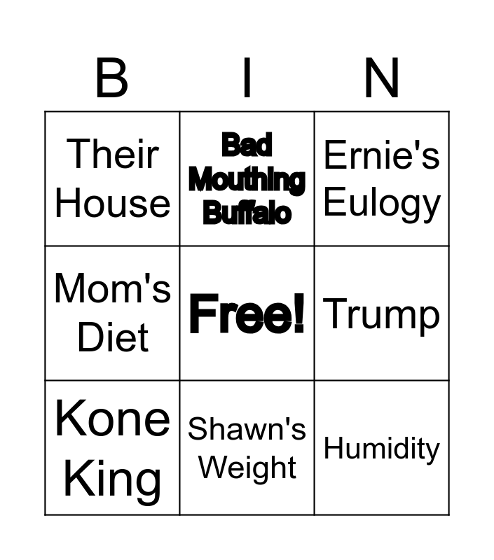 This bingo card has a free space and 8 words: Trump, Ernie's Eulogy, Bad Mouthing Buffalo, Kone King, Their House, Humidity, Mom's Diet and Shawn's Weight.
