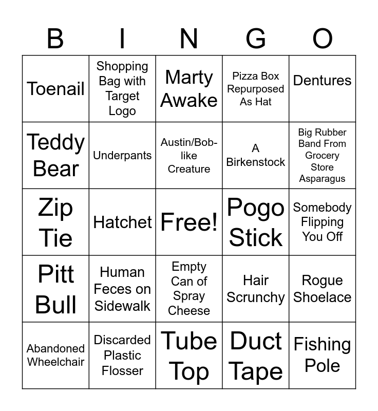This bingo card has a free space and 24 words: Human Feces on Sidewalk, Discarded Plastic Flosser, Austin/Bob-like Creature, Abandoned Wheelchair, Dentures, Toenail, Teddy Bear, Shopping Bag with Target Logo, Pogo Stick, Empty Can of Spray Cheese, A Birkenstock, Zip Tie, Hair Scrunchy, Rogue Shoelace, Underpants, Duct Tape, Somebody Flipping You Off, Marty Awake, Big Rubber Band From Grocery Store Asparagus, Hatchet, Fishing Pole, Pitt Bull, Pizza Box Repurposed As Hat and Tube Top.