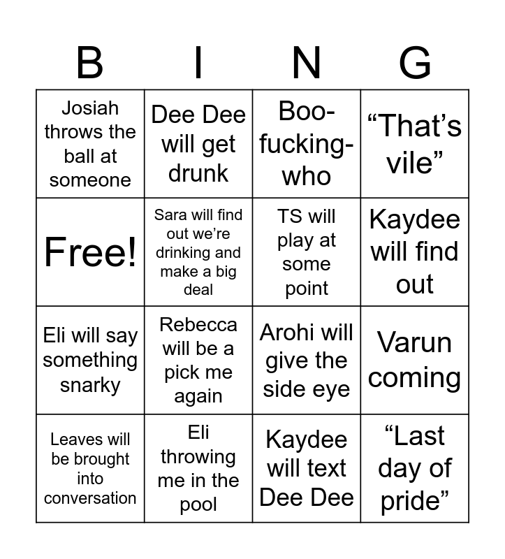 This bingo card has 16 words: Eli throwing me in the pool, Varun coming, Boo-fucking-who, Josiah throws the ball at someone, Eli will say something snarky, Dee Dee will get drunk, Arohi will give the side eye, Kaydee will text Dee Dee, Free!, Sara will find out we’re drinking and make a big deal, Leaves will be brought into conversation, “That’s vile”, Rebecca will be a pick me again, Kaydee will find out, TS will play at some point and “Last day of pride”.