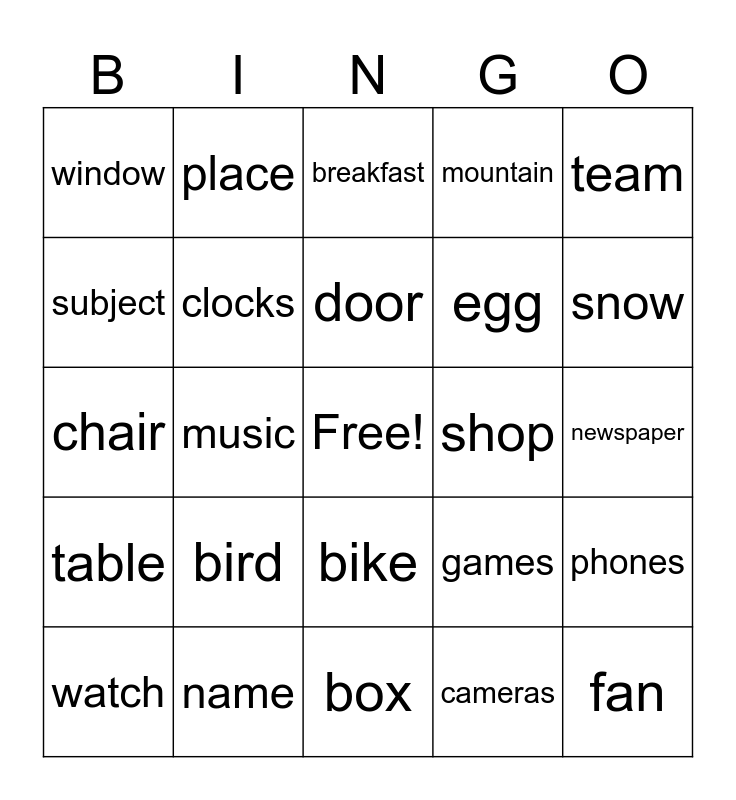 This bingo card has a free space and 24 words: bird, name, door, watch, team, window, subject, place, shop, bike, egg, chair, games, phones, clocks, cameras, newspaper, breakfast, snow, music, fan, table, mountain and box.