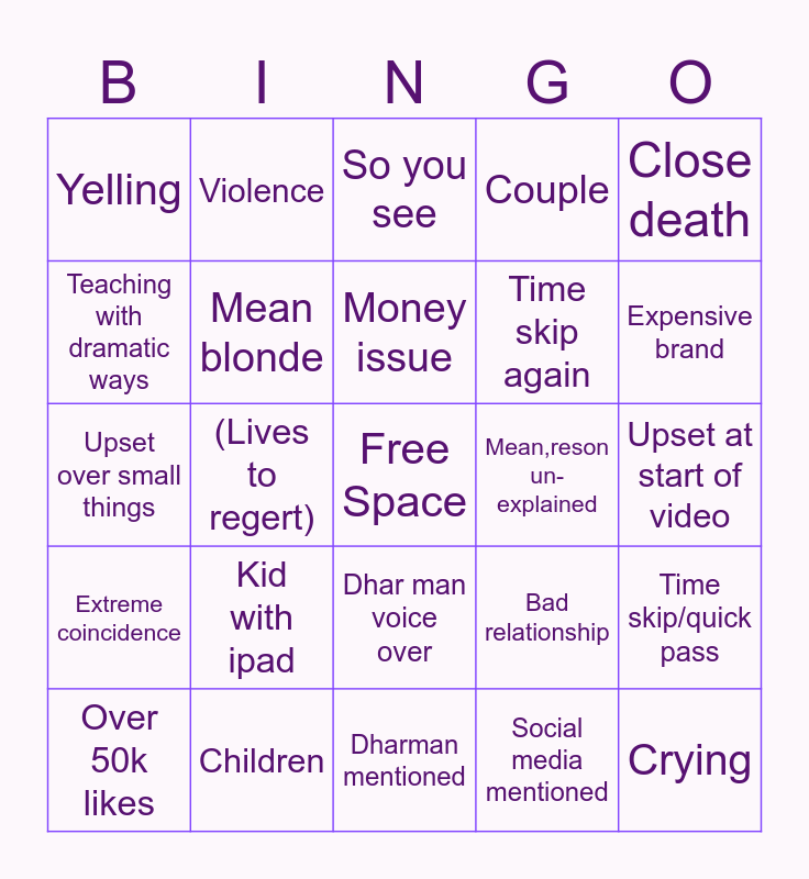 This bingo card has a free space and 26 words: Dhar man voice over, Social media mentioned, Money issue, Children, Close death, Yelling, Teaching with dramatic ways, Violence, Upset at start of video, Bad relationship, Time skip again, Upset over small things, Time skip/quick pass, Over 50k likes, (Lives to regert), Dad fired, Couple, Extreme coincidence, So you see, Crying, Expensive brand, Dharman mentioned, Mean,reson un-explained, Kid with ipad, Mean blonde and Pasta.