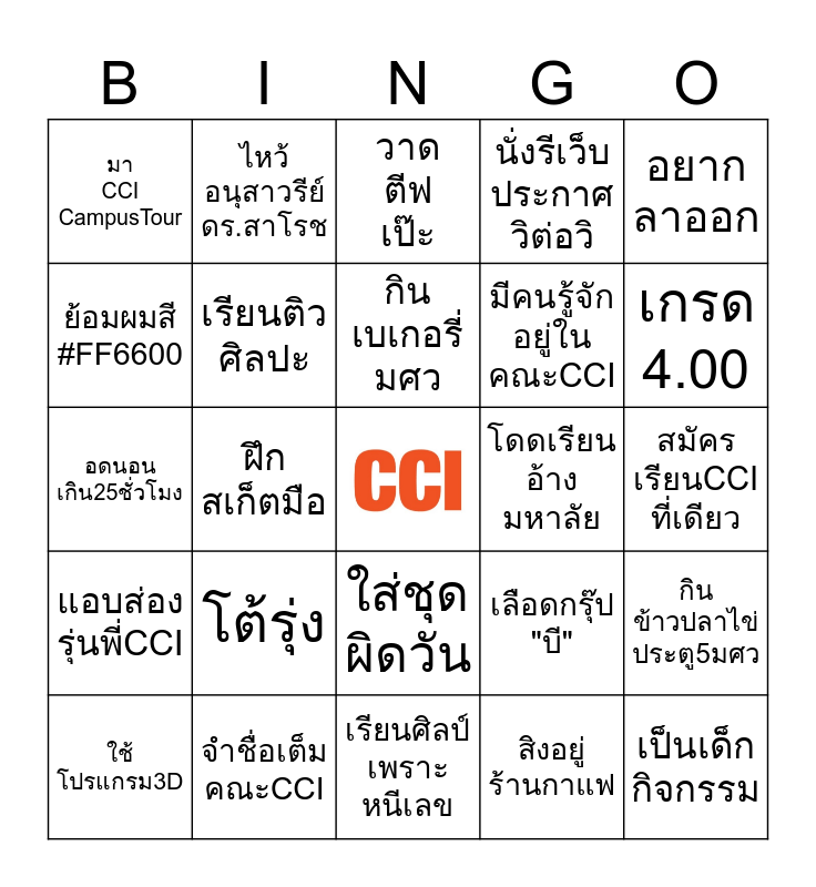 This bingo card has a free space and 29 words: ใช้โปรแกรม3D, ติดตาม โซเชียล ของคณะ, ฝึก สเก็ตมือ, มา CCI OpenHouse, มา CCI CampusTour, วาด ตีฟ เป๊ะ, เรียนติวศิลปะ, โต้รุ่ง, โดดเรียน อ้าง มหาลัย, จำชื่อเต็มคณะCCI, สมัครเรียนCCI ที่เดียว, เป็นเด็กกิจกรรม, เรียนศิลป์ เพราะ หนีเลข, สิงอยู่ ร้านกาแฟ, เกรด 4.00, แอบตดในห้องเรียน, ใส่ชุดผิดวัน, แอบส่องรุ่นพี่CCI, อยากลาออก, อดนอนเกิน25ชั่วโมง, เลือดกรุ๊ป "บี", เข้าCCI คนเดียว ในกลุ่ม เพื่อนมัธยม, มีคนรู้จักอยู่ในคณะCCI, ย้อมผมสี #FF6600, นั่งรีเว็บประกาศ วิต่อวิ, ไหว้อนุสาวรีย์ดร.สาโรช, กิน ข้าวปลาไข่ประตู5มศว, กิน เบเกอรี่ มศว and อยากเป็นสโมสรนิสิตคณะCCI.