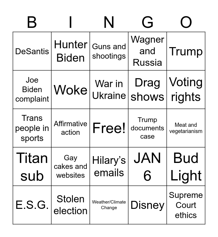 This bingo card has a free space and 24 words: Gay cakes and websites, Stolen election, War in Ukraine, E.S.G., Trump, DeSantis, Joe Biden complaint, Hunter Biden, Trump documents case, Hilary’s emails, Drag shows, Trans people in sports, JAN 6, Bud Light, Woke, Disney, Meat and vegetarianism, Guns and shootings, Voting rights, Affirmative action, Supreme Court ethics, Titan sub, Wagner and Russia and Weather/Climate Change.