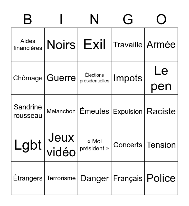 This bingo card has a free space and 29 words: Étrangers, Arabes, Melanchon, Macron, Aides financières, Exil, Guerre, Jeux vidéo, Expulsion, Terrorisme, Raciste, Police, Danger, Français, Le pen, Émigrés, « Moi président », Lgbt, Armée, Sandrine rousseau, Concerts, Argent, Impots, Chômage, Travaille, Noirs, Tension, Élections présidentielles and Onu.