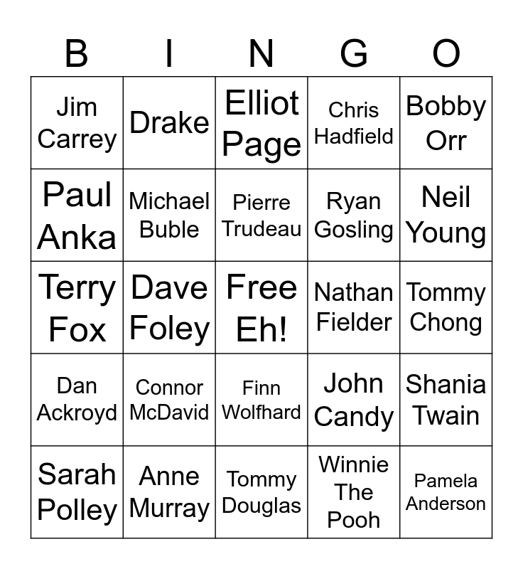 This bingo card has a free space and 53 words: Gordon Lightfoot, Pamela Anderson, David Suzuki, Winnie The Pooh, Connor McDavid, Rachel McAdams, Drake, Celine, Paul Anka, Avril Lavigne, Michael Buble, Stompin' Tom Conners, Shania Twain, John Candy, Ryan Reynolds, Sarah Polley, Pierre Trudeau, Nathan Fielder, Elon Musk, Bobby Orr, Dave Foley, Farley Mowat, Ryan Gosling, Jim Carrey, KallMeKris, Anne Murray, Geddy Lee, Sir Fredrick Banting, Brendan Fraser, Neil Young, William Shatner, Keifer Sutherland, Wolverine, Micheael Cera, Mike Myers, Justin Bieber, Chris Hadfield, Tommy Douglas, Elliot Page, Dan Levy, Shawn Mendes, Georges St-Pierre, Tommy Chong, Michael J Fox, Russell Peters, Finn Wolfhard, Leslie Neilson, Wayne Gretzky, Terry Fox, Dan Ackroyd, Christine Sinclair, Catherine O'Hara and Margaret Atwood.