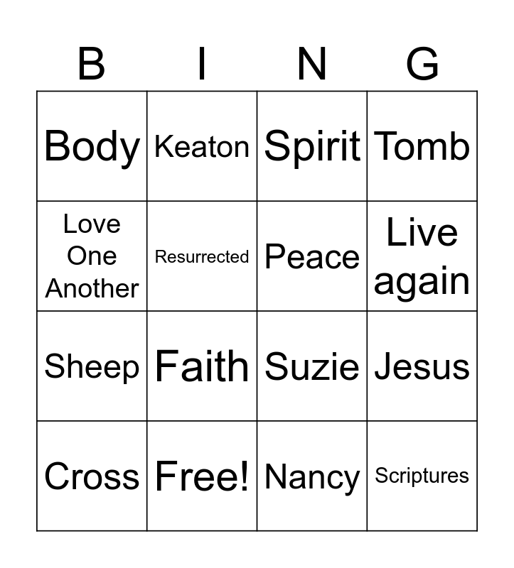 This bingo card has 16 words: Free!, Jesus, Spirit, Body, Sheep, Keaton, Suzie, Nancy, Love One Another, Resurrected, Cross, Tomb, Faith, Live again, Peace and Scriptures.