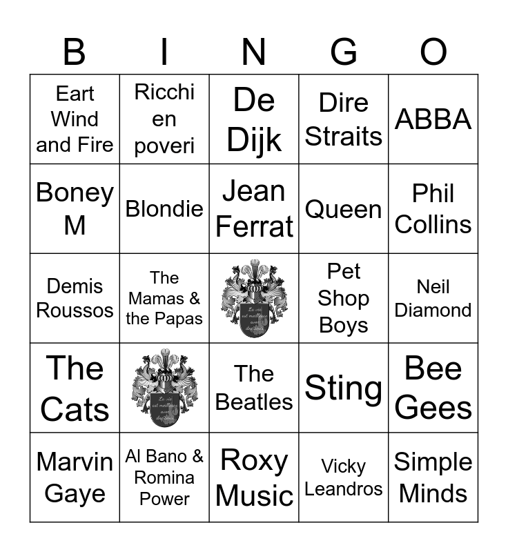 This bingo card has 1 images, a free space and 24 words: Roxy Music, Jean Ferrat, Marvin Gaye, ABBA, Eart Wind and Fire, Boney M, Ricchi en poveri, Pet Shop Boys, The Beatles, Queen, Demis Roussos, Sting, Bee Gees, Blondie, The Buoys, Neil Diamond, De Dijk, Phil Collins, The Mamas & the Papas, Simple Minds, Al Bano & Romina Power, The Cats, Dire Straits and Vicky Leandros.
