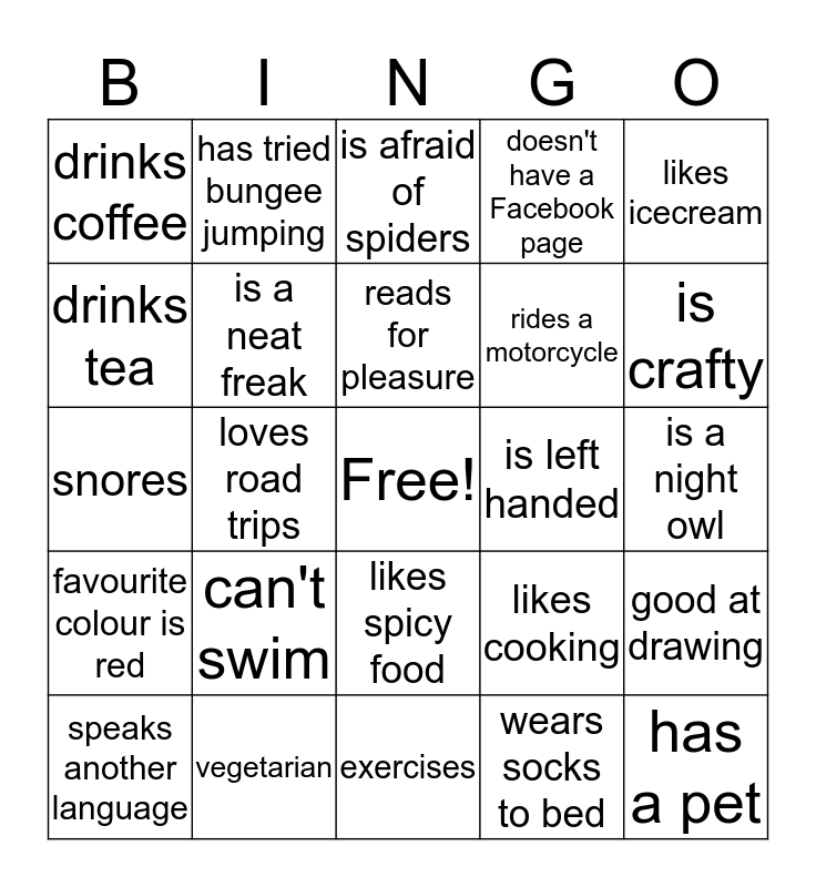 This bingo card has a free space and 24 words: can't swim, vegetarian, reads for pleasure, speaks another language, likes icecream, drinks coffee, drinks tea, has tried bungee jumping, is left handed, likes spicy food, rides a motorcycle, snores, likes cooking, good at drawing, is a neat freak, wears socks to bed, is a night owl, is afraid of spiders, is crafty, loves road trips, has a pet, favourite colour is red, doesn't have a Facebook page and exercises.